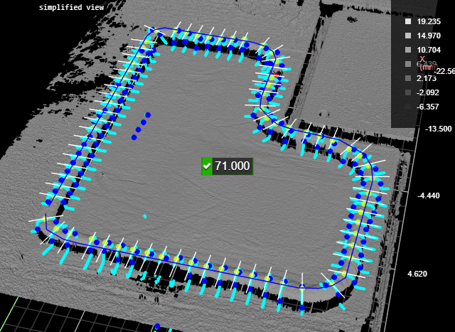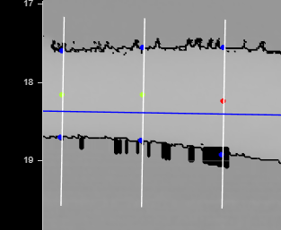 - Dark blue dotes: The detected sides of the track. These represent the width of the track under that ruler.